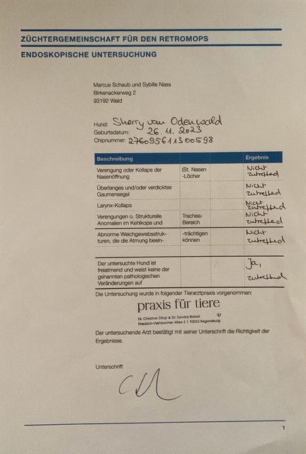 Er wurde mittlerweile mit besten Ergebnissen endoskopisch untersucht und steht geeigneten Hündinnen zur Zucht zur Verfügung.